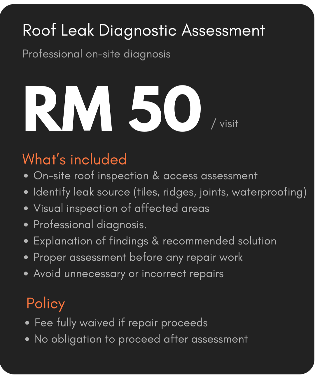 Air-cond service Choose your service planClick the package you love to get started ! Professional on-site diagnosis to identify the true source of leakage. No guesswork.Diagnose first. Repair right.Click to Book Now ! Advanced Roof Leak Diagnostic